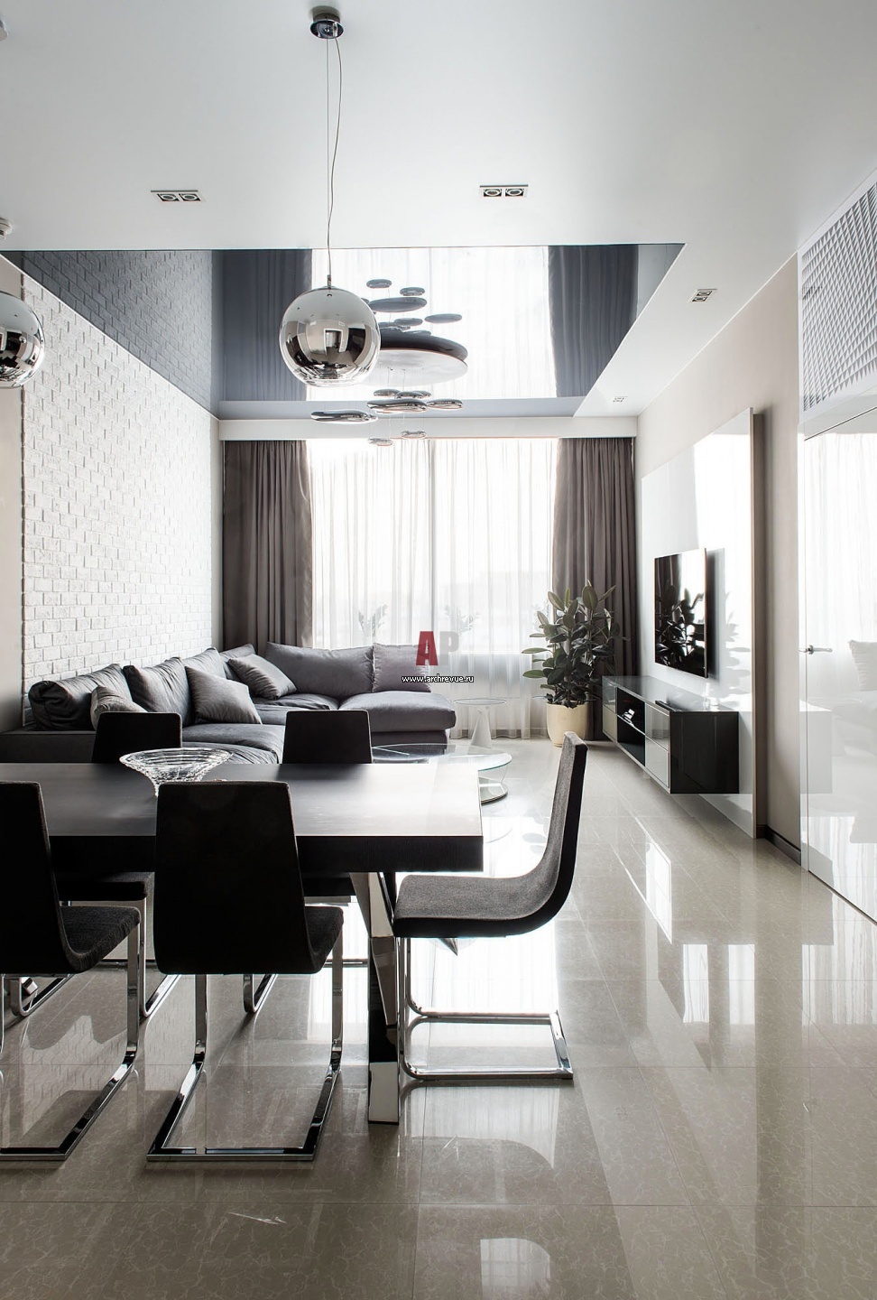 Гостиная-столовая в квартире для молодого спортсмена. На полу – светлый керамогранит под мрамор. Обеденный стол, стулья, Calligaris. Светильники, Artemide.