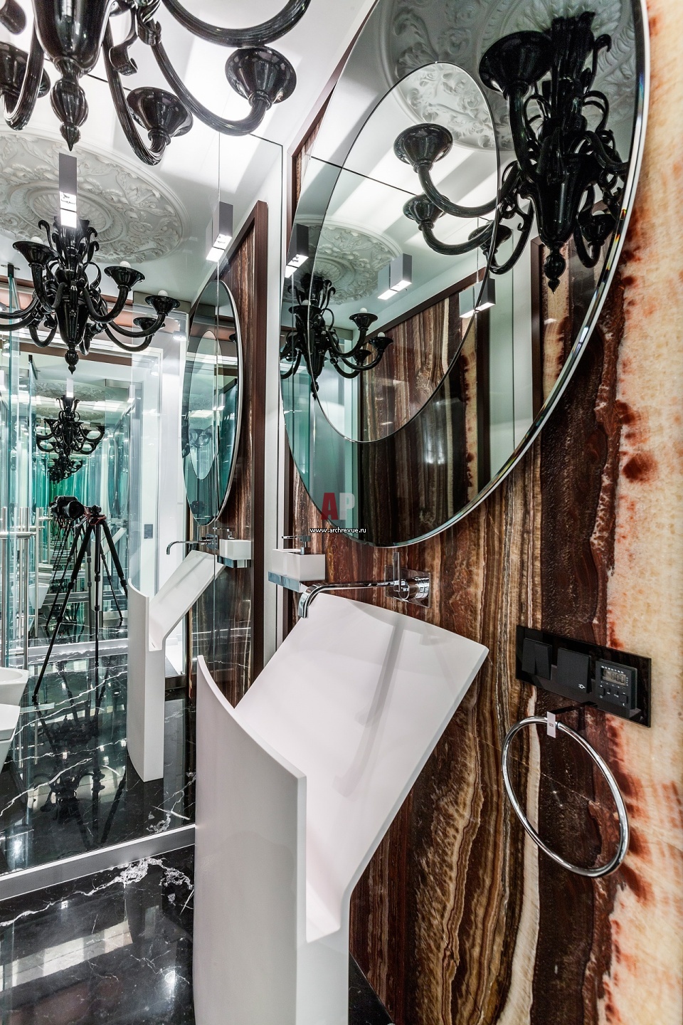 Стены гостевого санузла в эпатажной квартире оформлены ониксом и панорамными зеркалами. Раковина, Antonio Lupi. Люстра, Sylcom. Зеркало, Porada.