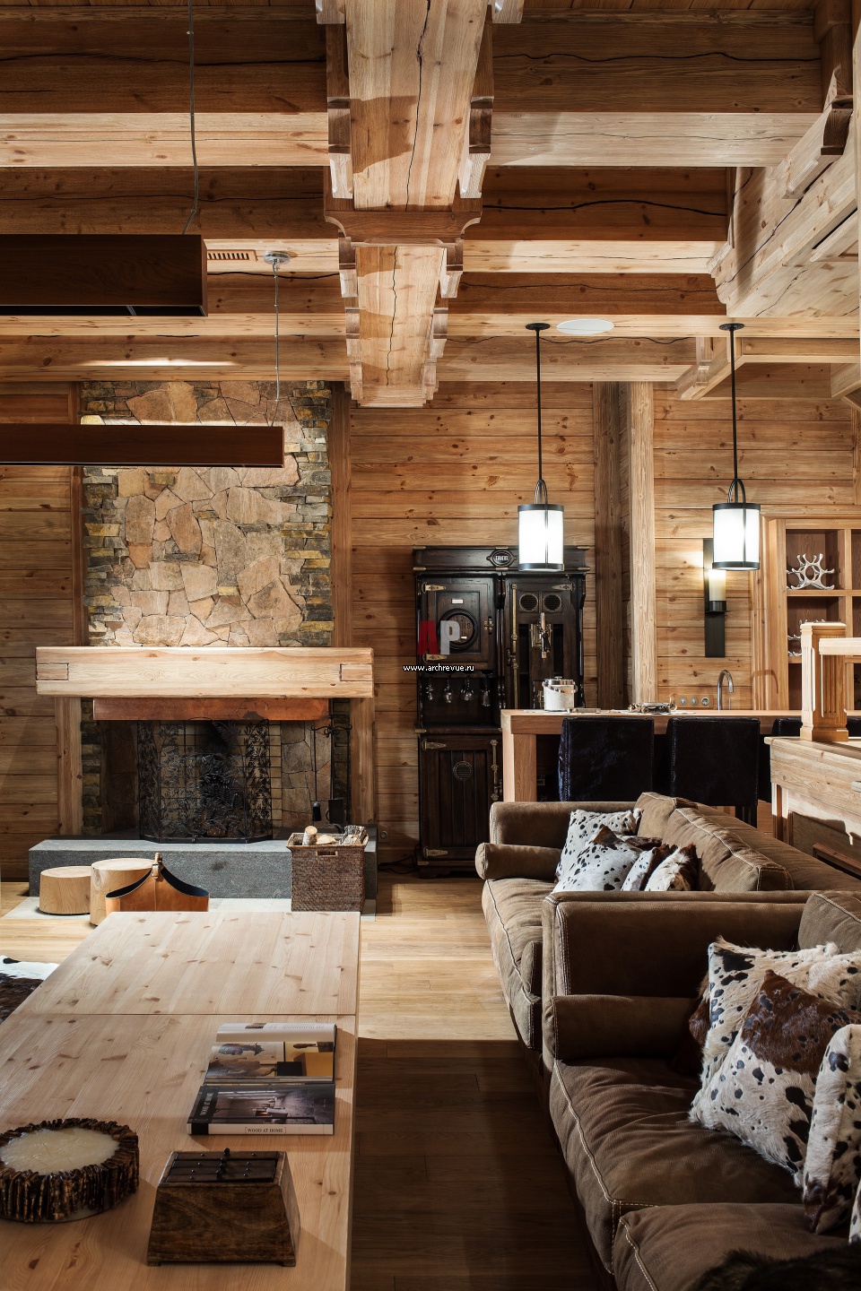 Организующим и структурирующим элементом цокольного этажа является каимин с живым огнем, выполненный по индивидуальному проекту архитектора. Нижнее основание камина — цельная гранитная плита с эффектом старения фасадных плоскостей, который получен благодаря технике вытравления верхнего слоя и открытия структуры камня. Верхняя часть камина облицована «рваным», колотым натуральным камнем, общий оттенок которого подобран с учетом единой теплой цветовой гаммы интерьера.