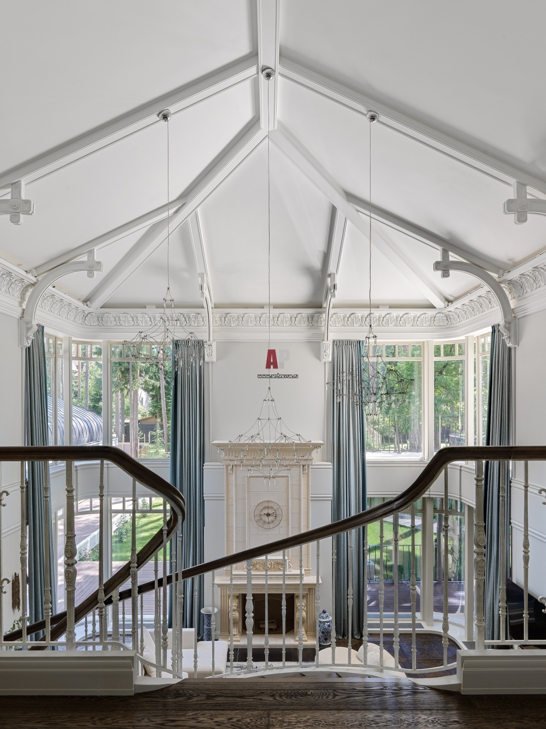 Вид со второго этажа лестницы. Сводчатый потолок с лепным декором в стиле готики окрашен в однотонный белый цвет.