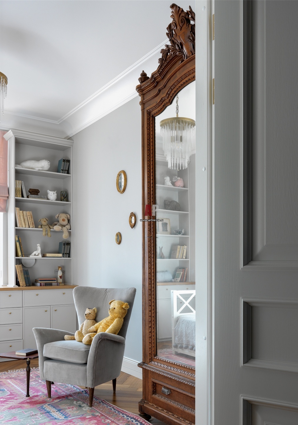 Комната дочери. При входе стоит большой старинный шкаф с зеркальной дверью, который дизайнер с хозяйкой нашли по объявлению и купили у людей, покидавших роскошную квартиру в доходном доме в связи с переездом.