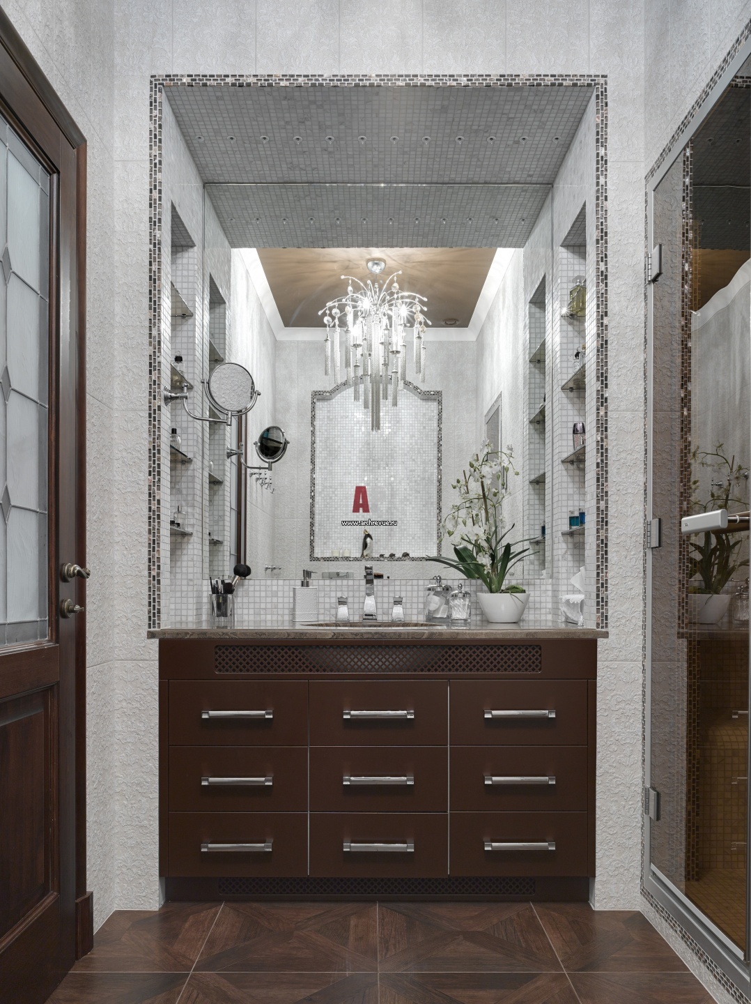 Хозяйская ванная комната. Умывальник из темного дерева со встроенным холодильником для хранения косметики сделан на заказ. Сантехника, Villeroy & Boch.