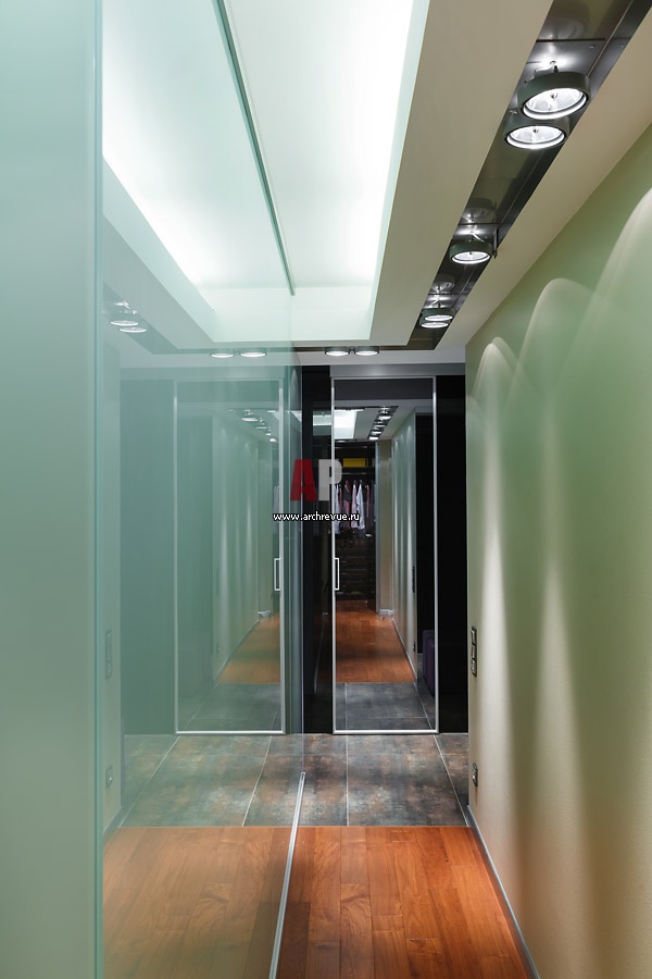 Коридор между общественной и приватной частью. В торцах по обе стороны расположены гардеробные. Стены облицованы стеклом. Динамику подчеркивает встроенный в темную нишу потолочный светильник.