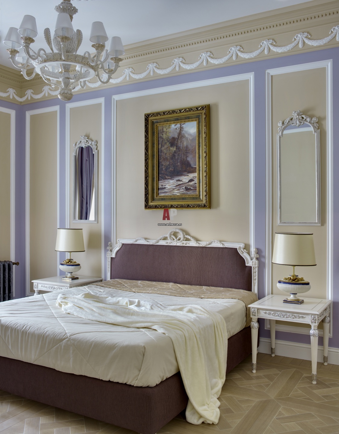 Гостевая спальня на втором этаже в стиле французской классики и в золотисто-сиреневых тонах. Лепной декор из гипса сделан на заказ, по эскизам. Кровать, люстра, зеркала, Chelini. Прикроватные столики, Giulio Bonanomi. Консоль, Salda. Однотонный паркет из светлого дерева, поставщик «Мир Паркета».