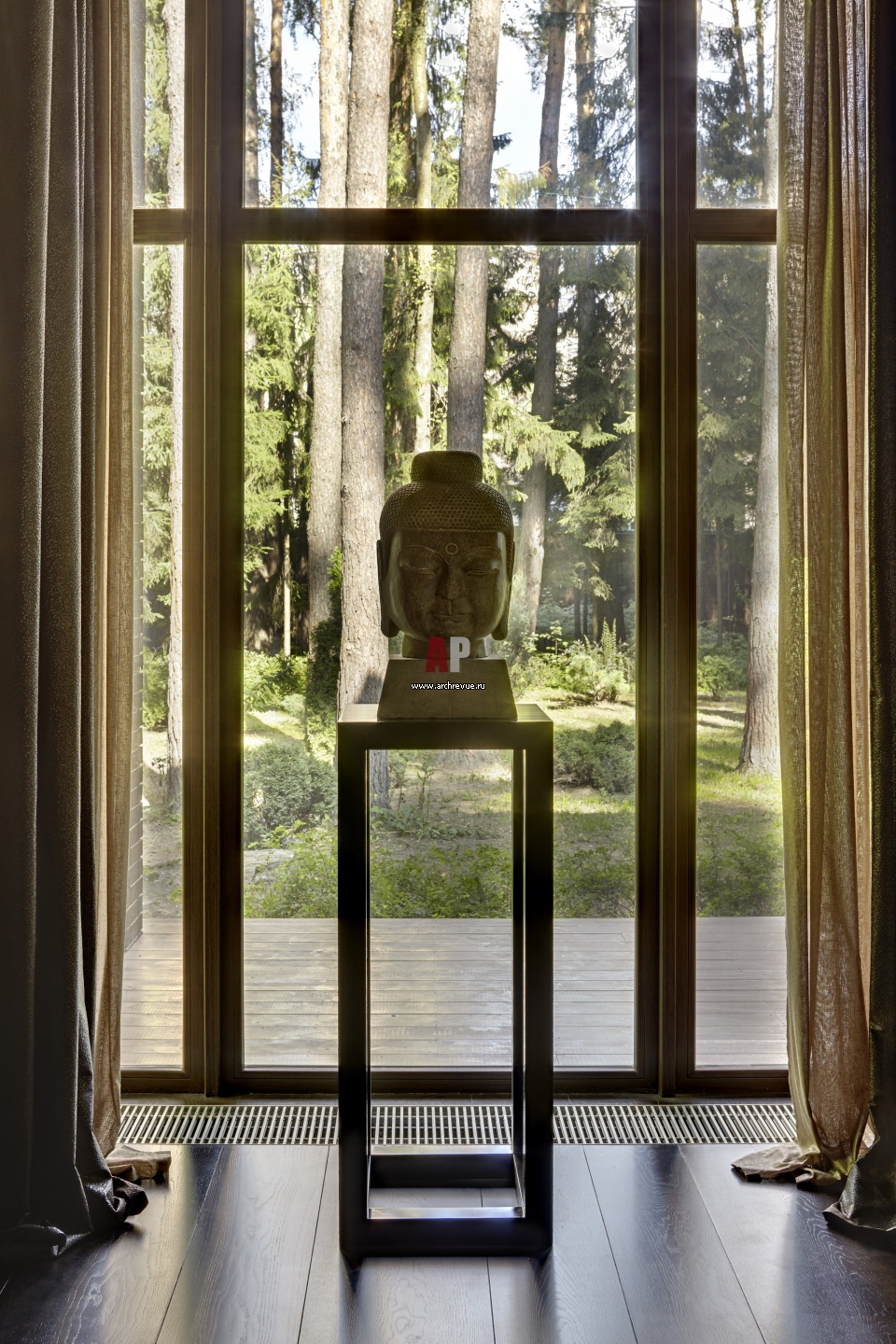 Панорамные окна в гостиной ориентированы на ландшафт внутреннего двора. Скульптура «Голова Будды» привезена из Китая.