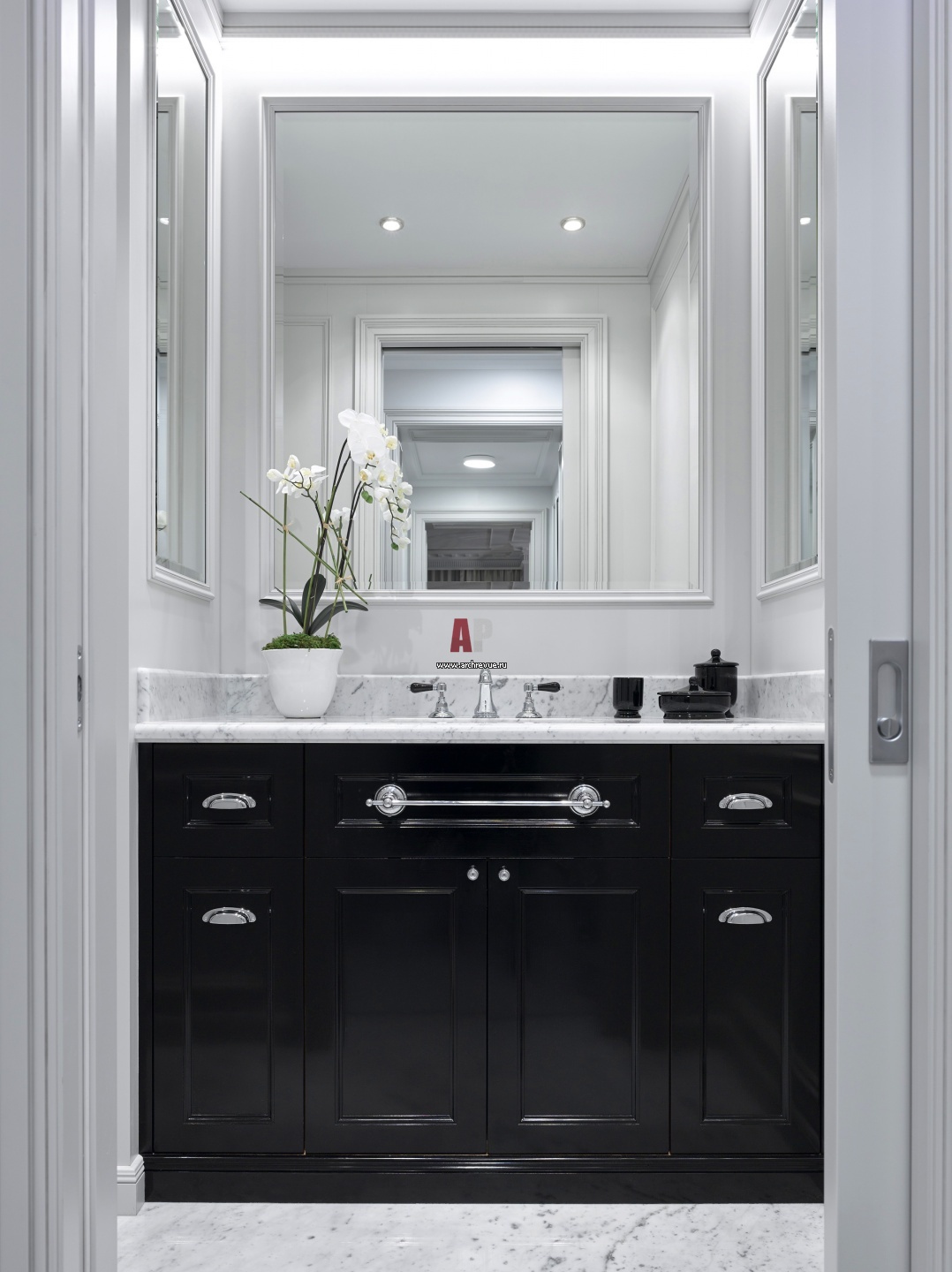 Интерьер ванной комнаты. Тумба под раковину из темного дерева с глянцем сделана на заказ. Сантехника, Devon & Devon.