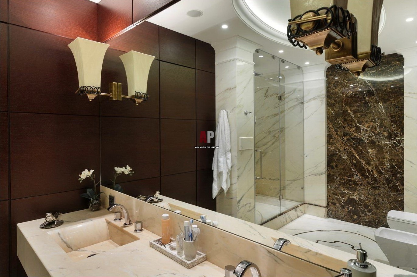 Семейная квартира в нежных тонах с элементами ар-деко и неоклассики. Интерьер ванной комнаты.
