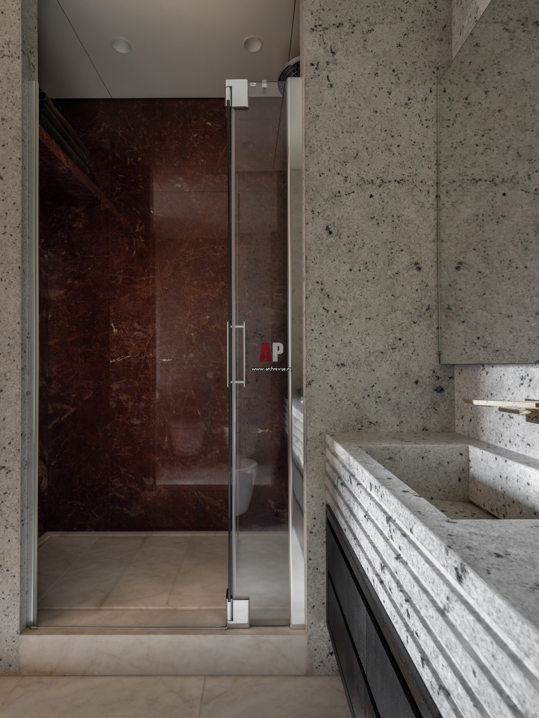 Душевая. Стена в душевой облицована насыщенным красным мрамором.