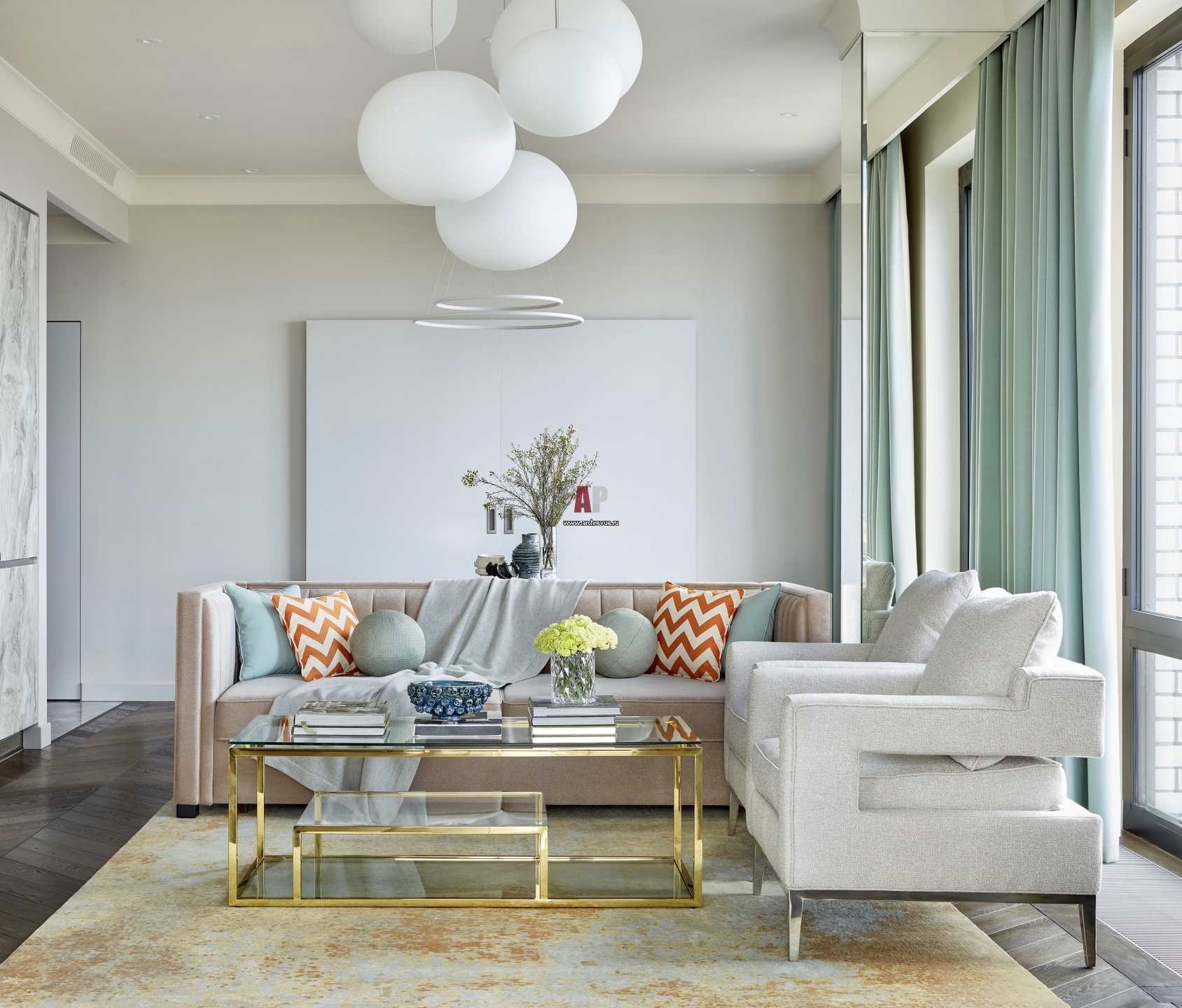 Спальня отделена от гостиной раздвижными дверями. При закрытых дверях создается интересный эффект, как будто там нет больше комнат, а это просто объемные стеновые панели.