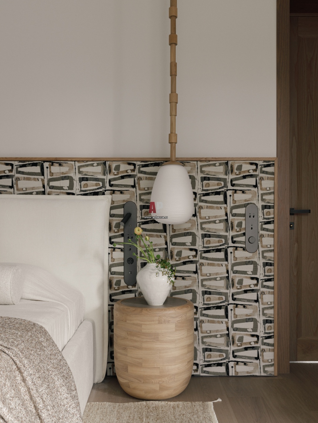 Одна из спален на втором этаже. С нейтральной фоновой палитрой помещения контрастирует акцентный текстиль. Им отделано изголовье кровати.