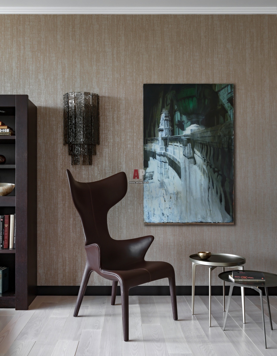 Гостиная. На стене – шелковые обои. Кресло, Driade. Табуретки, Flexform. Картина Эдуарда Яшина. Бра из муранского стекла, Patrizia Volpato.