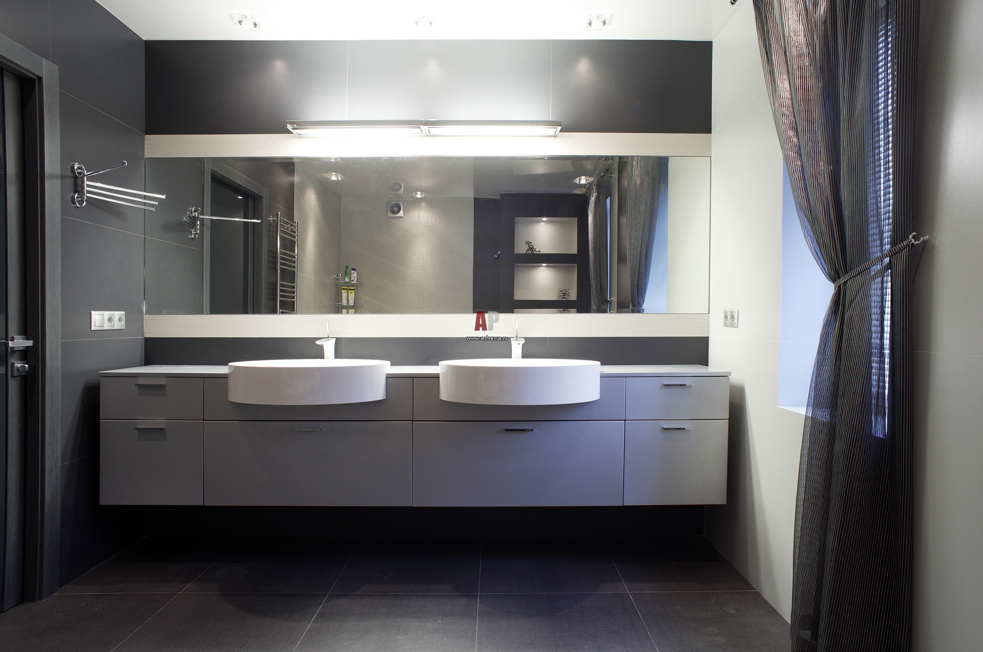 Фото интерьера санузла в современном стиле. Две раковины встроены в единое подстолье.