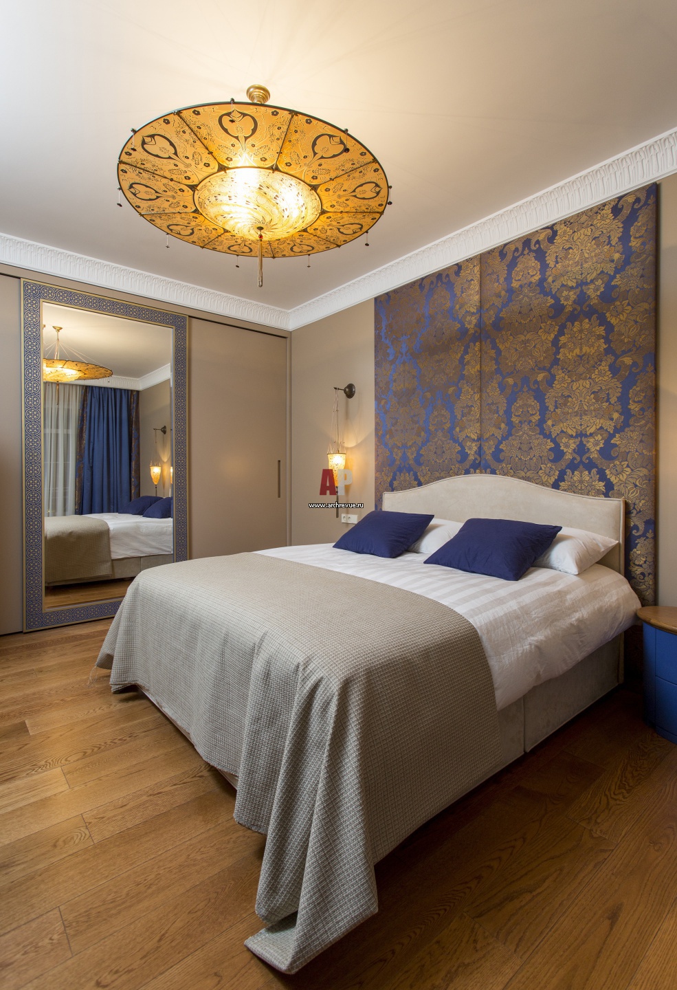 Интерьер спальни выполнен в венецианском стиле. Тон в ней задает светильник из венецианского стекла с ручной росписью, а также резная зеркальная рама. Стена за изголовьем кровати Vispring оформлена текстильными панелями лавандово-золотистого цвета с дамасками.