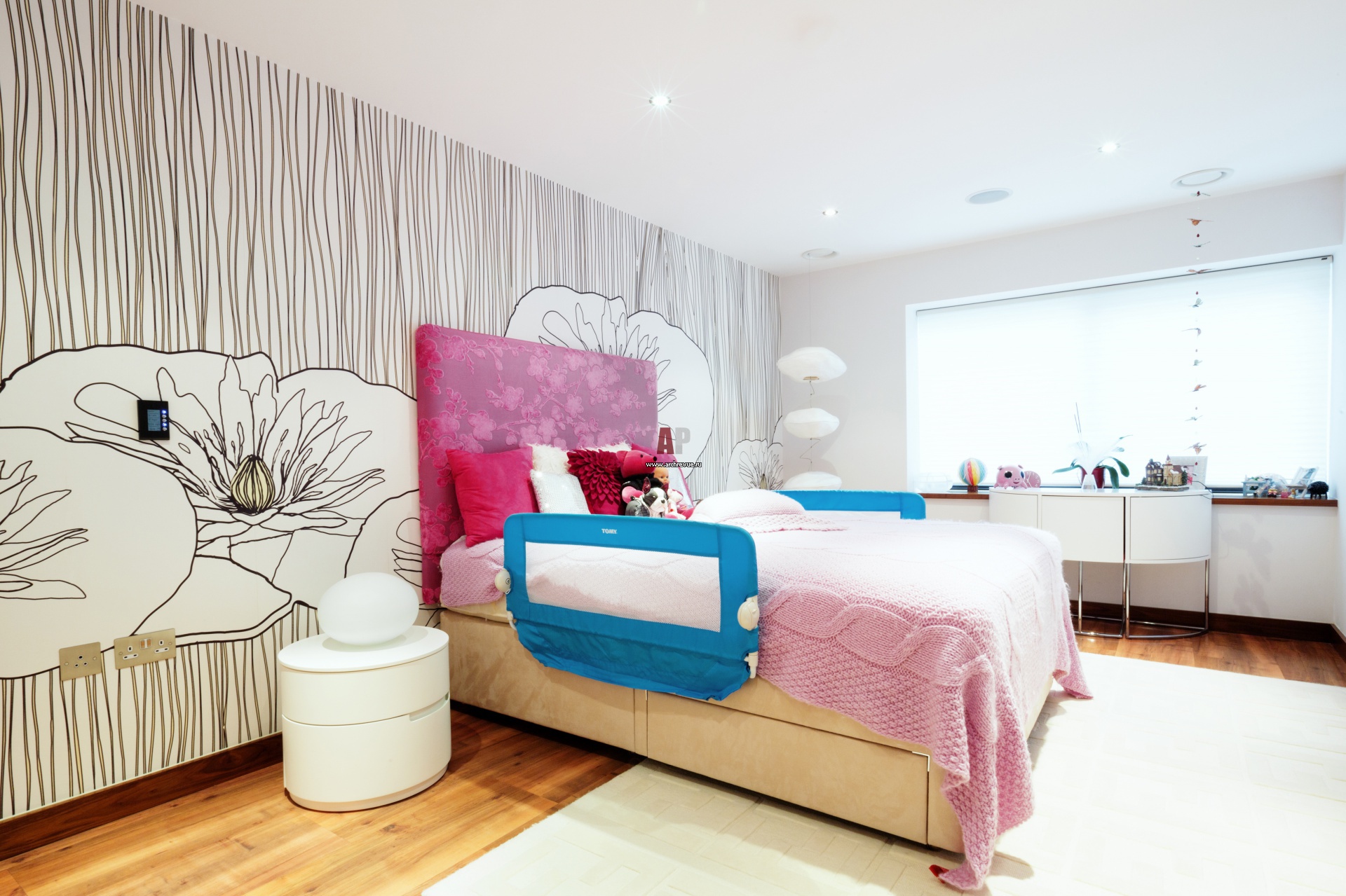 Интерьер детской комнаты девочки. Стена за кроватью оформлена графичными обоями с изображением кувшинок.