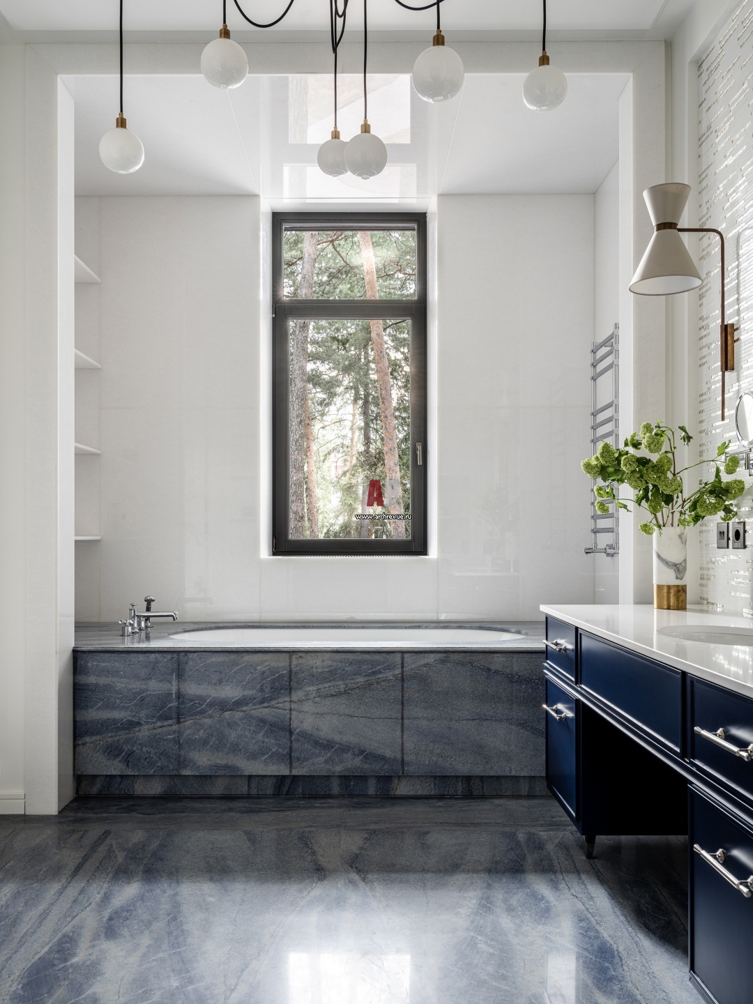 Ванная комната оформлен лаконично и роскошно: светлые стены, теплый пол, авторская мебель и окно в сад.