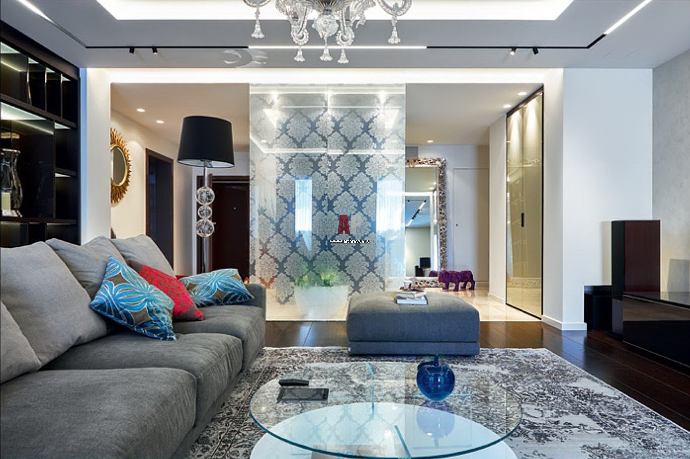 Гостиную и прихожую визуально разделяет стеклянная перегородка с классическим орнаментом. Диван, B&B Italia. Журнальный столик, Cassina.