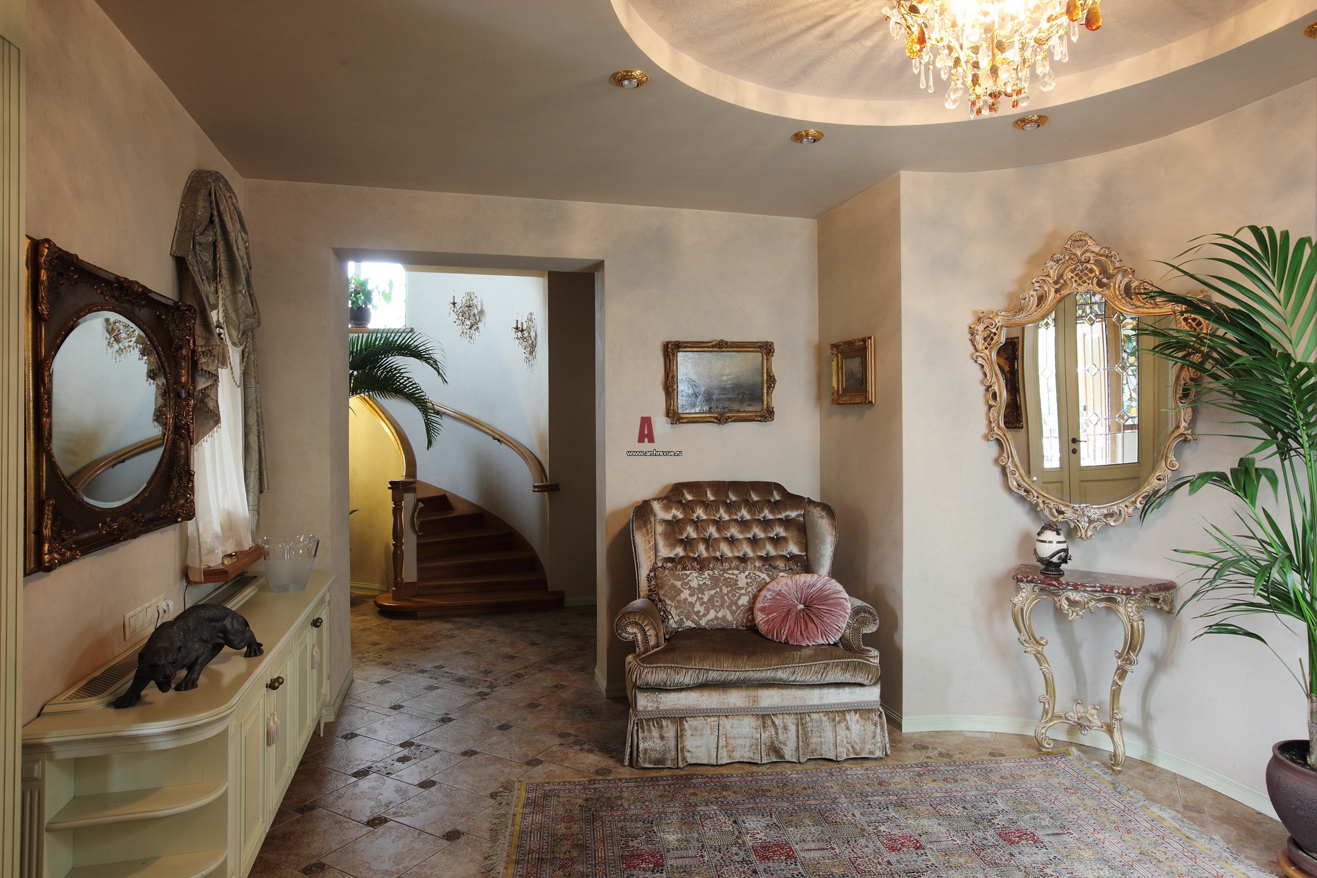 Лестничный холл в прихожей. Белая консоль – по эскизам авторов проекта. Круг на потолке оформлен трафаретной штукатуркой с изображением пионов.