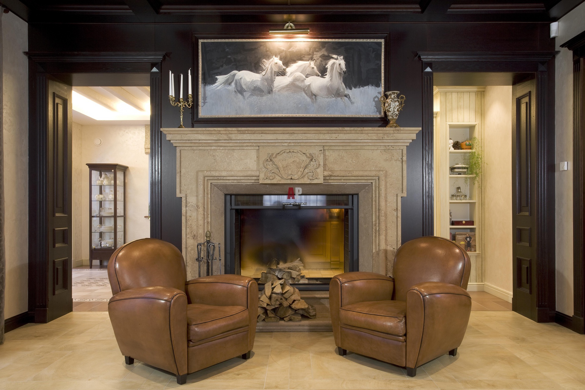 Зона камина в гостиной. Портал камина выполнен из травертина в духе старых французских интерьеров, в центре – геральдический знак. Кресла из светлой коричневой кожи в стиле ретро. Картина «Белые лошади» работы художника Зинаиды Буравовой, холст акрил.