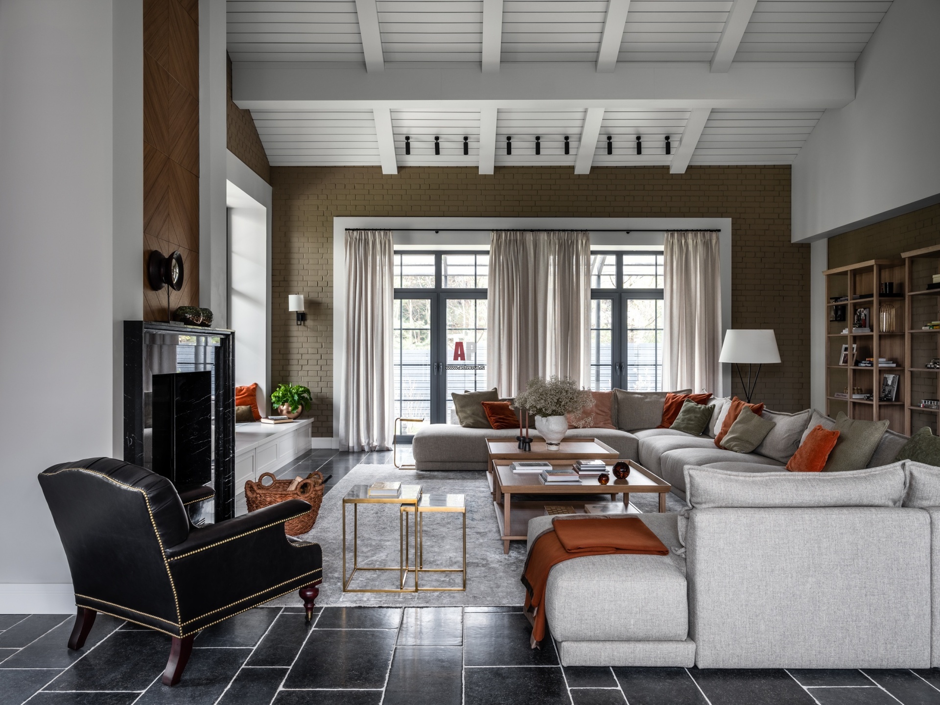 Гостиная и кухня-столовая решены как общее пространство с большими окнами, скатным, максимально высоким потолком, пошитым светлой доской. На полу – черный сланец трех разных размеров. Мебель, Dantone Home, Neptune. Светильники, Visual Comfort & Co.