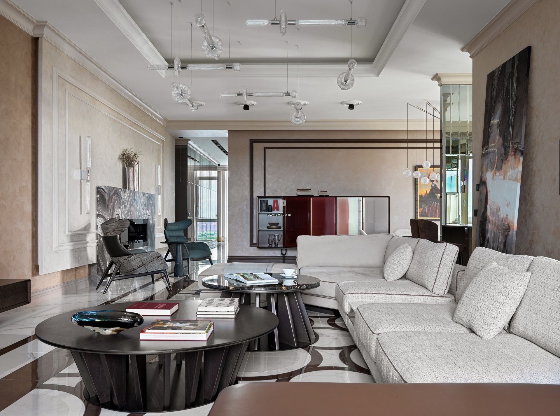 Общая гостиная выполнена в нейтральной светло-серой палитре. Стены оформлены декоративной штукатуркой с эффектом перламутра и муара. Зеркальная тумба сделана на заказ. Диван и журнальные столики, Angelo Cappellini.