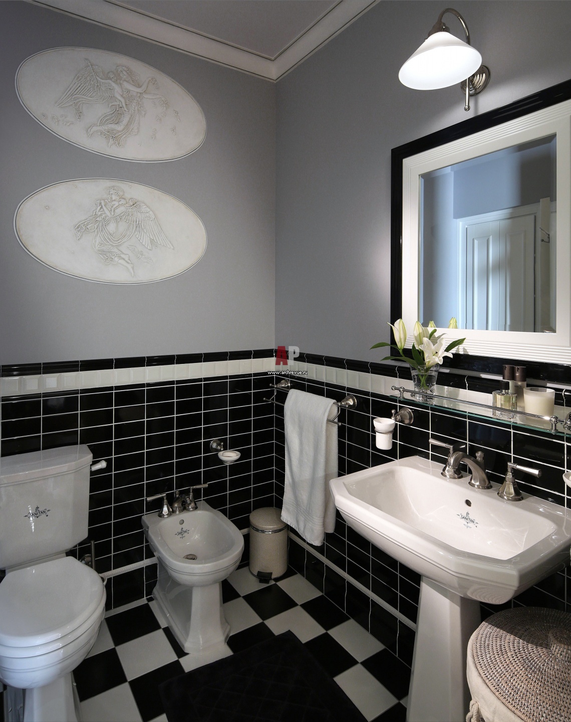 Детский санузел решен в контрастной черно-белой гамме. На стенах – лепные гипсовые медальоны, выполненные в индивидуальном порядке под проект.