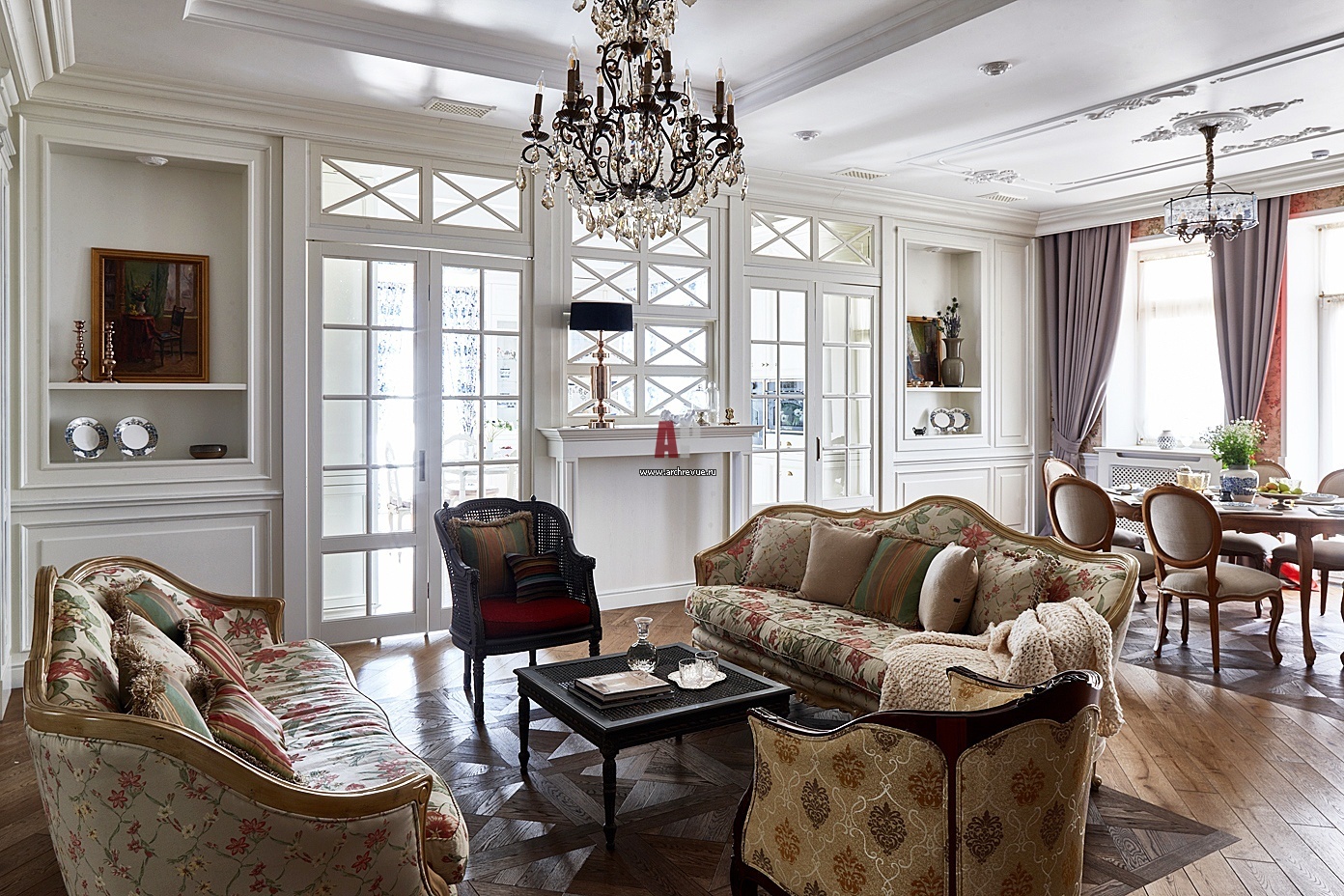 Интерьер гостиной дома с элементами традиционной русской усадьбы и ностальгической летней дачи.