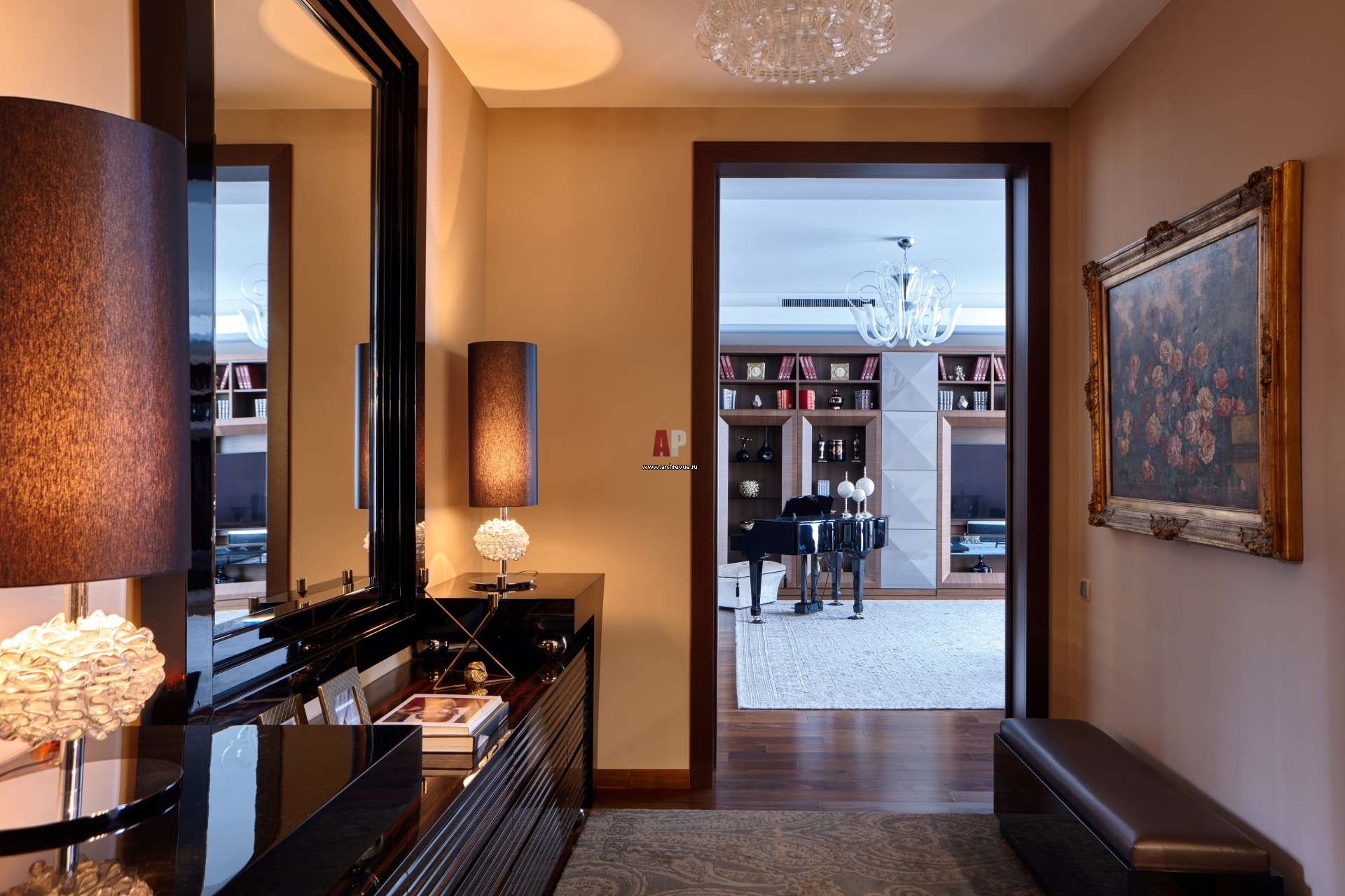 Входная группа обозначена комодом в стиле ар-деко из полированного дерева.
