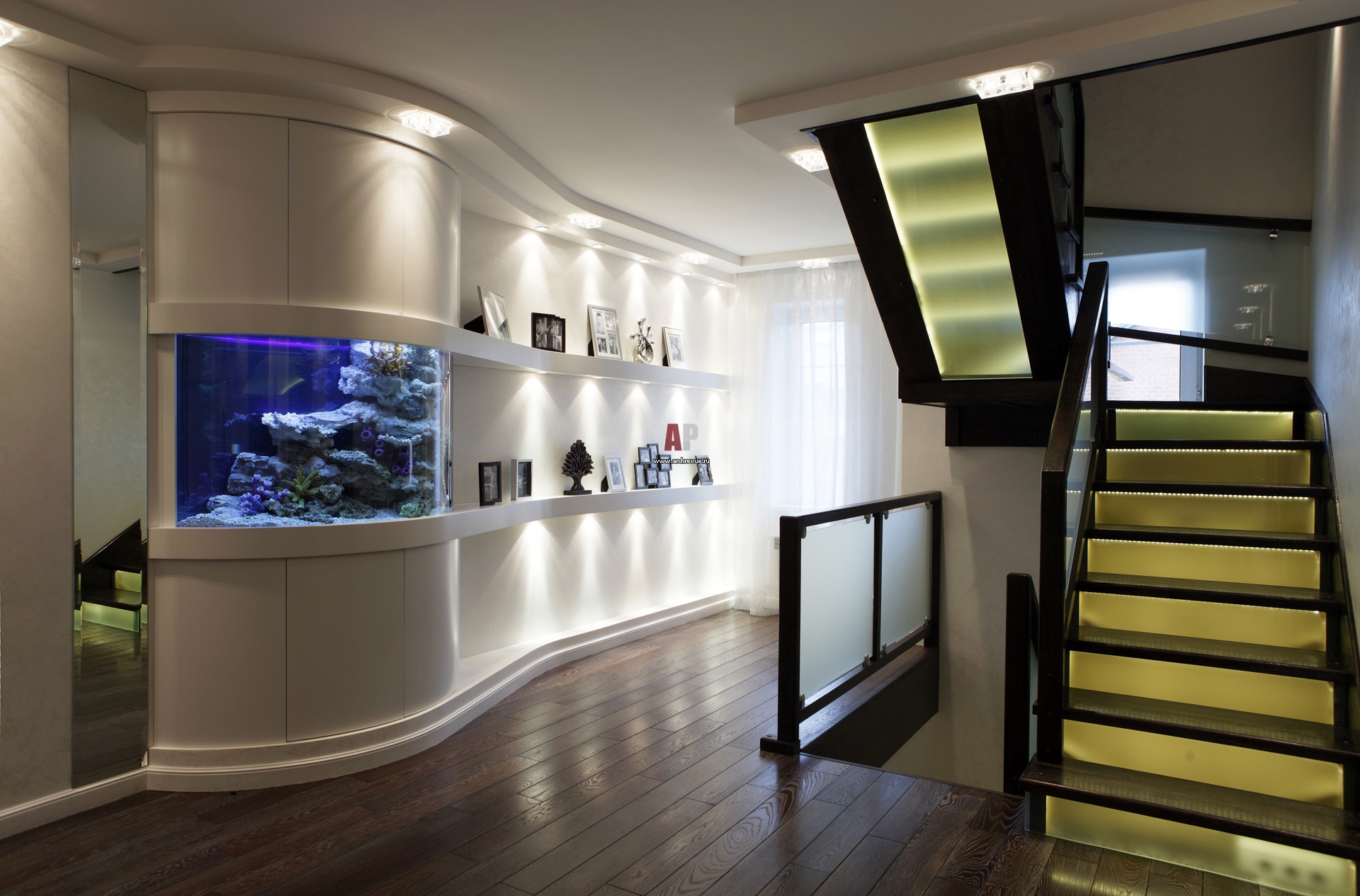 Фото холла второго этажа с лестницей и аквариумом. Ступени лестницы из тонированного дуба, подступенки – из матового стекла за которым встроены светодиодные ленты.