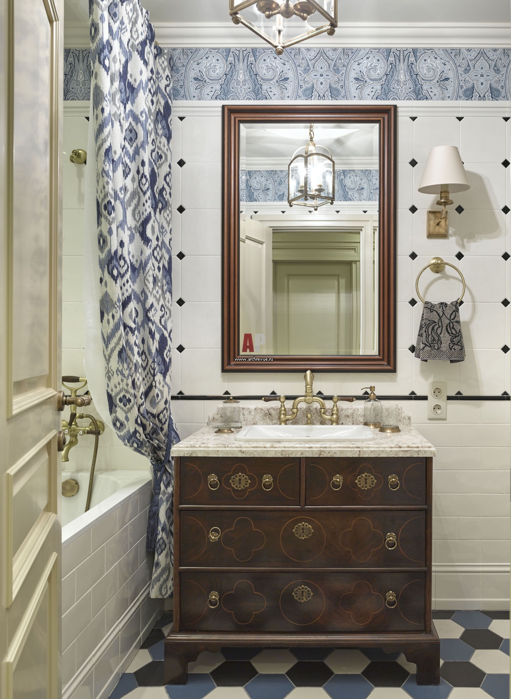Интерьер ванной комнаты на приватной половине в стиле неоклассика. Настенная белая керамическая плитка с синими вставками, Ceramiche Grazia. Верх стен оклеен обоями с темно-синим орнаментом на белом фоне, Thibaut. Ванна, Villeroy & Boch. Раковина Duravit. Тумба под раковину, JLC.