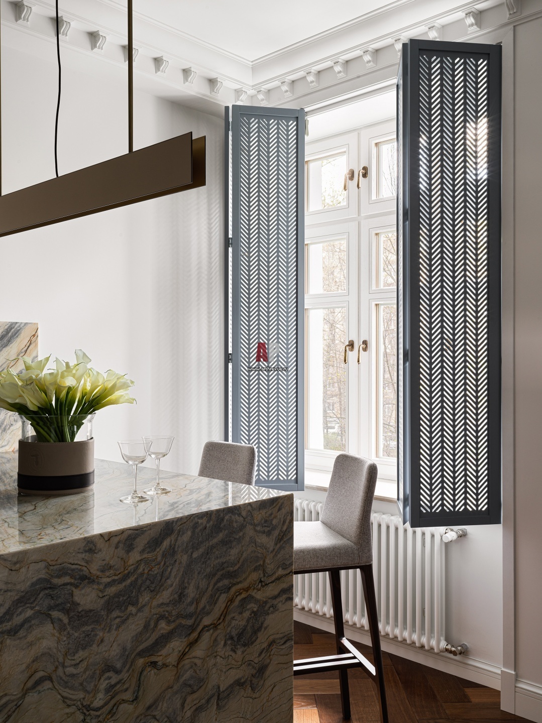 Кухня. Барные стулья, Roche Bobois. Голубые ставни визуально облегчают и освежают интерьер. Профильный светильник, Sovet Italia.