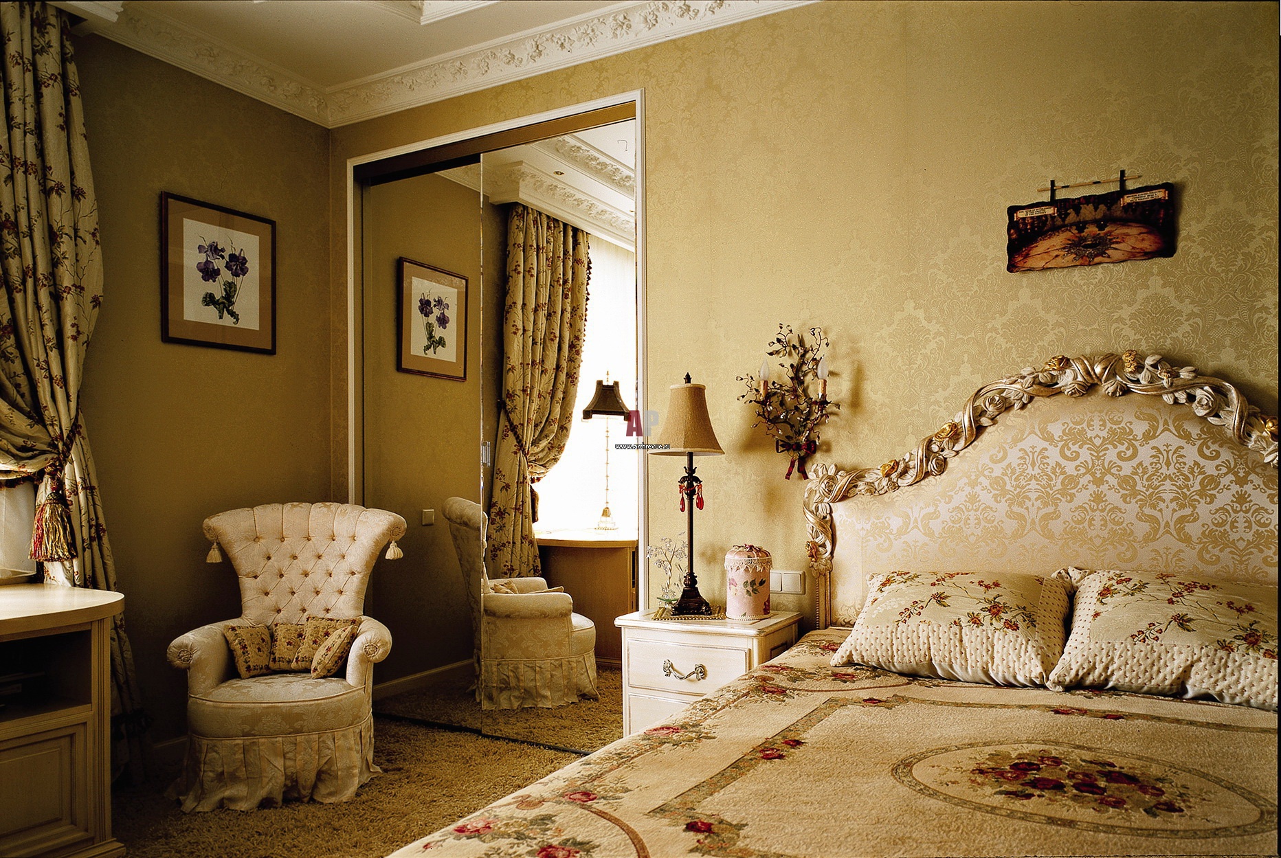 На стенах спальни – текстильные обои с медальонами набивного рисунка. Кровать Provasi.