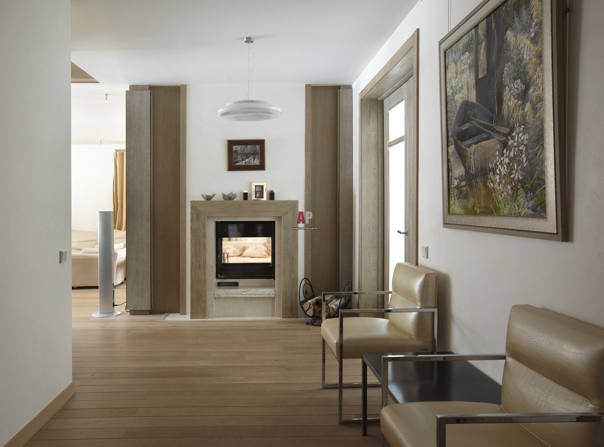 Портал биокамина оформлен камнем и обрамлен панелями из беленого дуба.