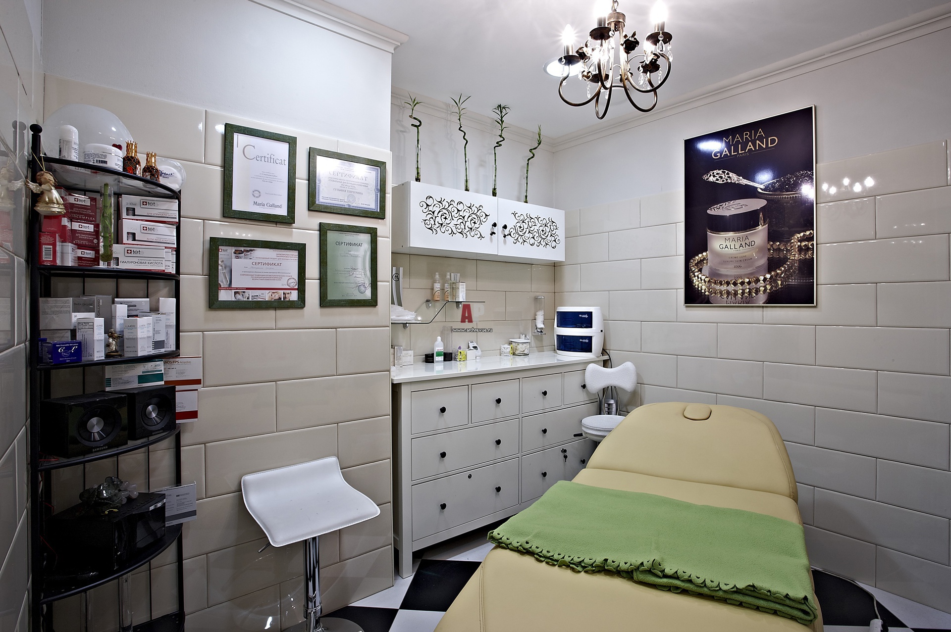 Интерьер косметологического кабинета в пастельной цветовой гамме. На стенах - крупноразмерная глянцевая плитка-«кабанчик».