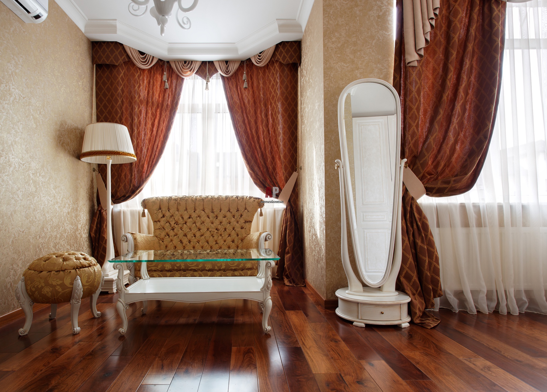 Зона отдыха в эркере. Дизайн штор и лепнина в классическом стиле. Диван в технике капитоне, Volpi.
