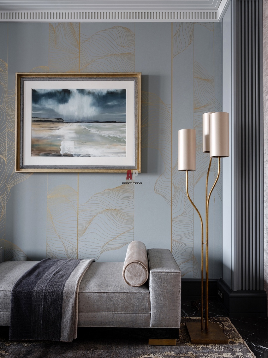 Интерьер гостиной. Банкетка, Amy Somerville. Торшер в отделке из латуни, Porta Romana.