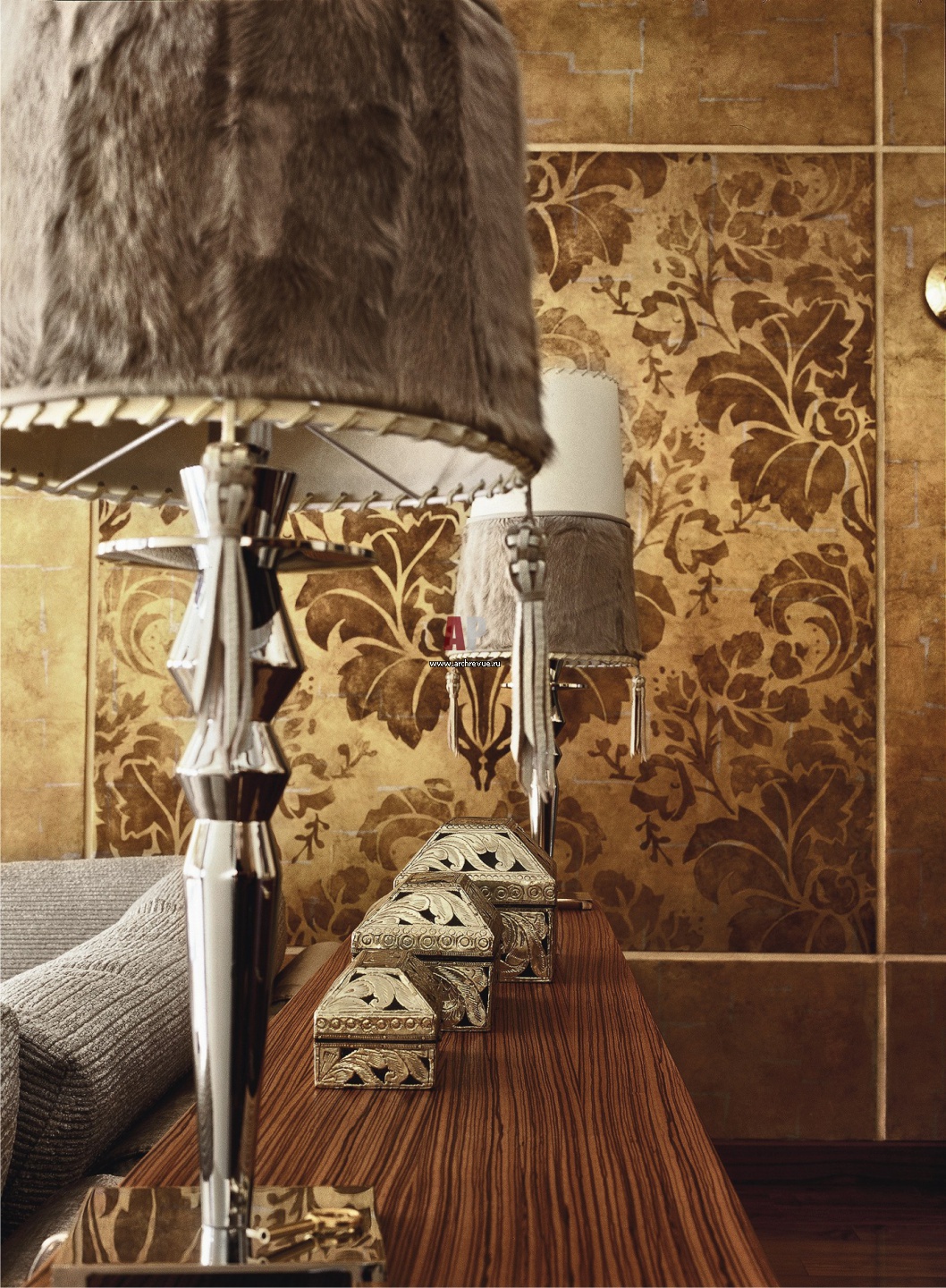 На настенном панно изображен цветочный орнамент. Рисунок был взят с обоев, увеличен в размерах и переосмыслен архитектором.