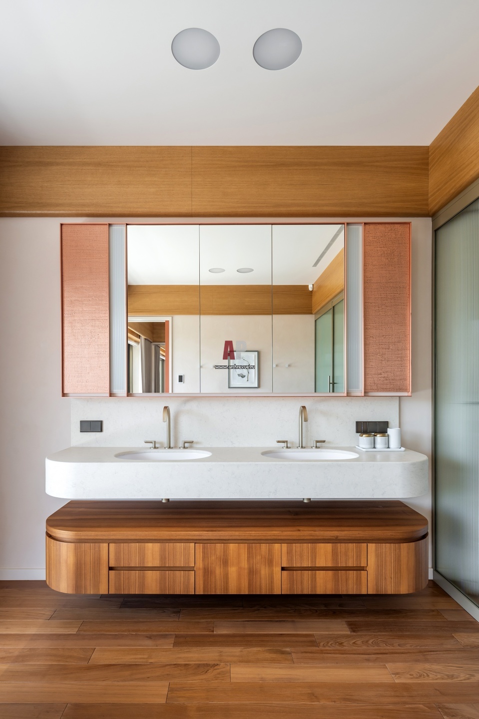 Санузел. Столешница умывальника выполнена из кварцевого агломерата.