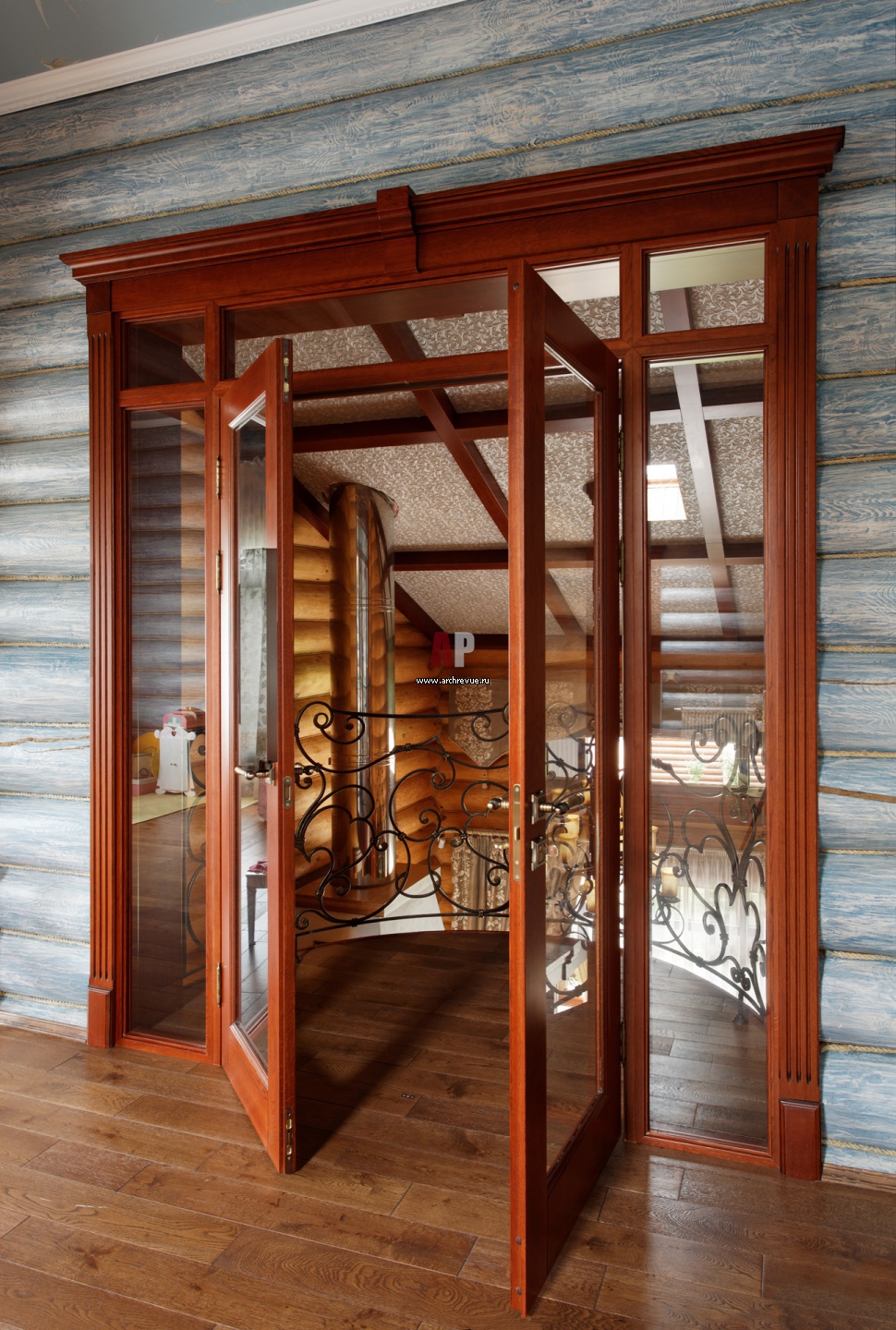 За распашными дверями из ольхи с прозрачными витражами – выход на полукруглый балкон. С него открывается вид на каминный зал первого этажа.