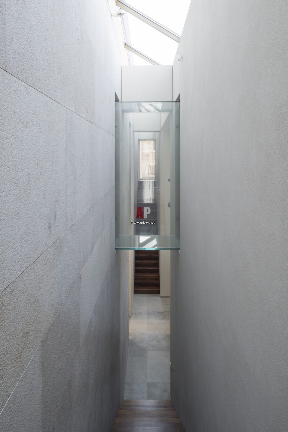 Стеклянный мостик на втором этаже соединяет хозяйскую спальню и ванную комнату. Перегородки оснащены встроенными датчиками, которые реагируют на движение и стены из прозрачных становятся матовыми.