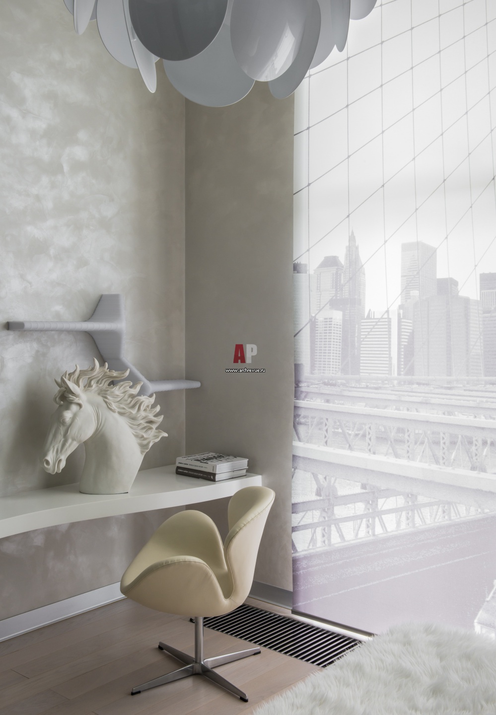 Интерьер спальни выдержан в светлых перламутрово-серых тонах. Подвесной консольный столик выполнен из искусственного камня. Кресло, Arne Jacobsen (модель Swan).