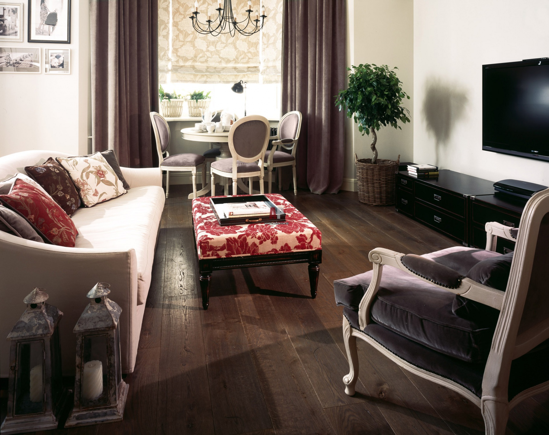 Диванная группа в гостиной. На полу жилых помещений – широкая массивная доска из копченого дуба.