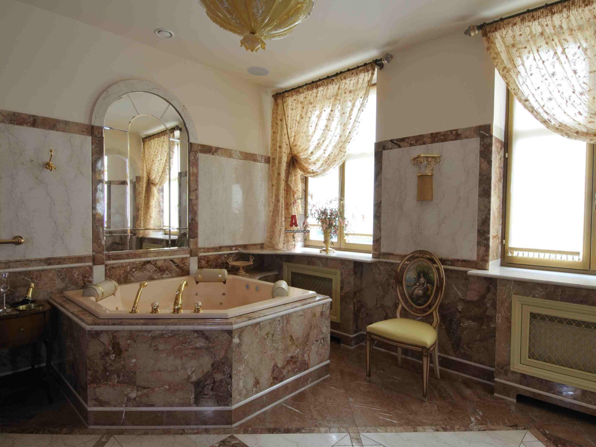 В интерьере хозяйского санузла автор использует один вид мрамора в двух контрастных цветах и всевозможных видах: полированный, состаренный, нарезанный в плитки, в слэбах. Санузел оформлен в оттеках абрикосового цвета с тонировкой стен и потолка.