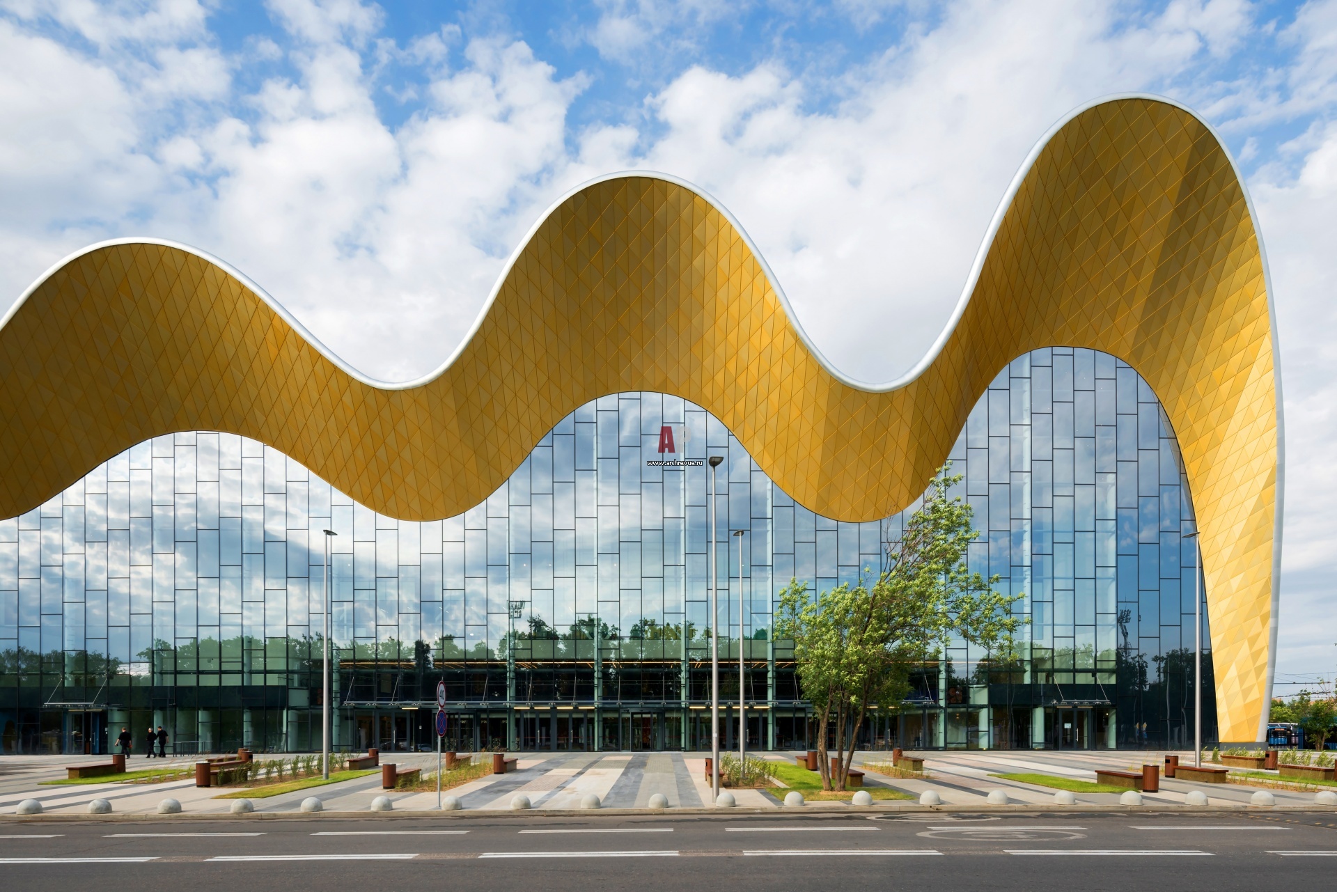 Несущие конструкции – монолитный железобетон. Основные конструкции покрытия – металлические балки и фермы. Фасад вентилируемый, в отделке используются алюминиевые панели, витражное остекление с алюминиевым профилем.