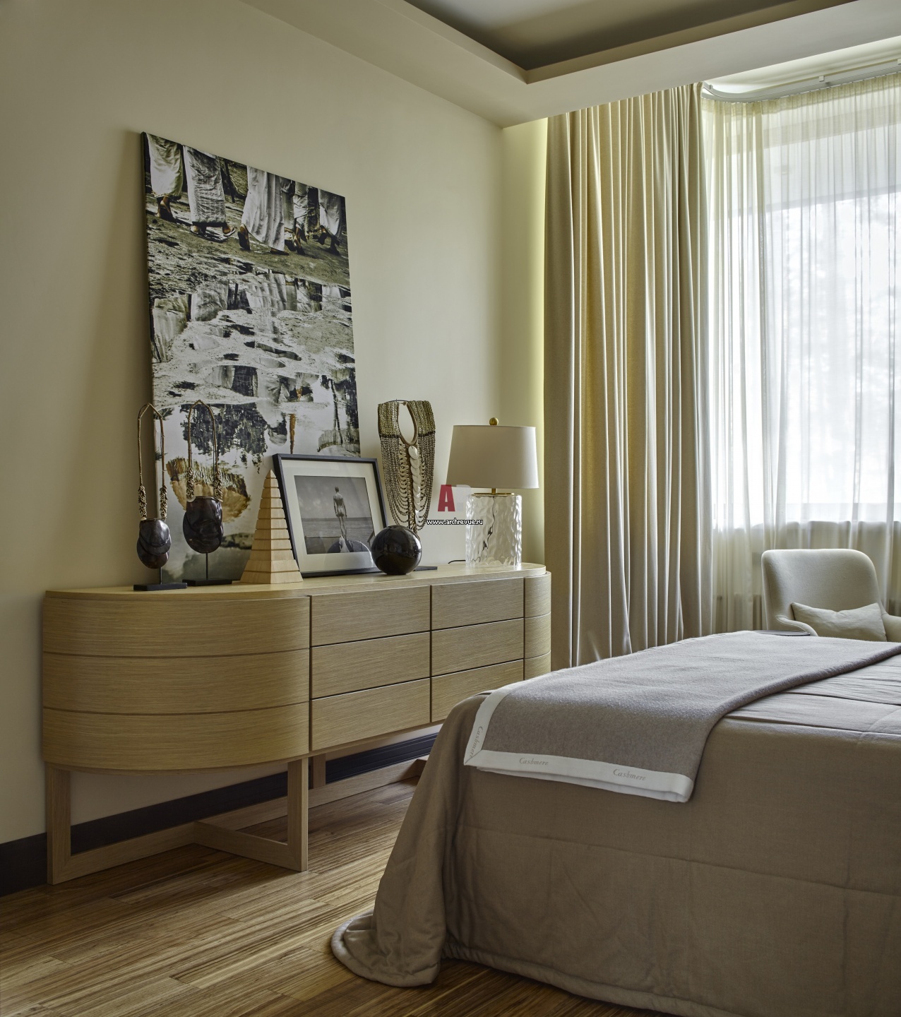 Фото интерьера спальни в теплых медовых тонах. Комод, Porada. Шторы с четкими вертикальными складками поддерживают заданный в гостиной ритм.