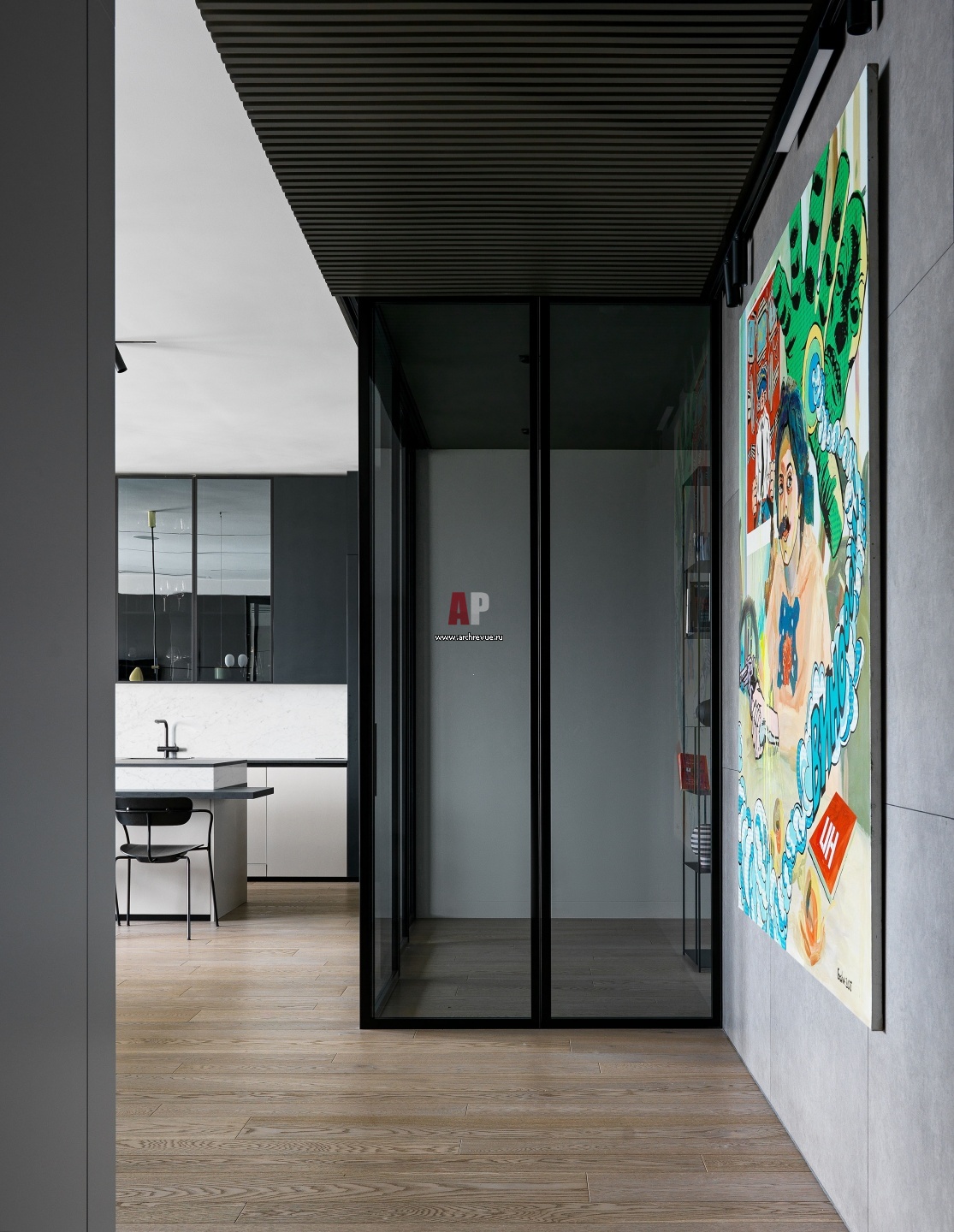 Входная группа. Гипсовые панели на потолке коридора, Paraline, выкрашены в темный цвет (краска Farrow & Ball, Mole‘s Breath 276).