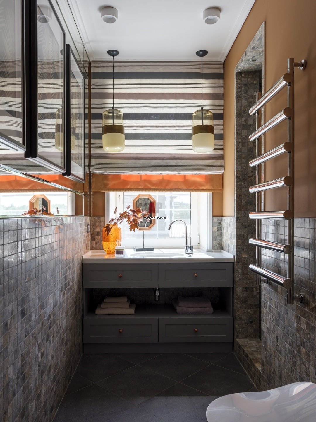 Ванная комната при хозяйской спальне пусть и небольшая, но удобная. Чтобы разместить в ней комфортную душевую, пришлось раковину встроить под окном и сделать столешницу продолжением подоконника. Сантехника, Villeroy & Boch. Светильники, Vistosi.