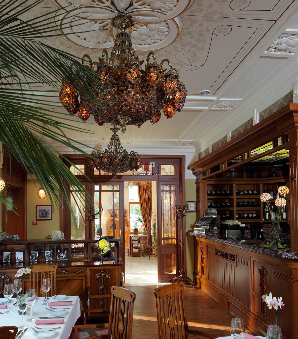 Фото барной зоны. Особенно впечатляют потолки. Они декорированы лепниной с позолотой и украшены росписью.