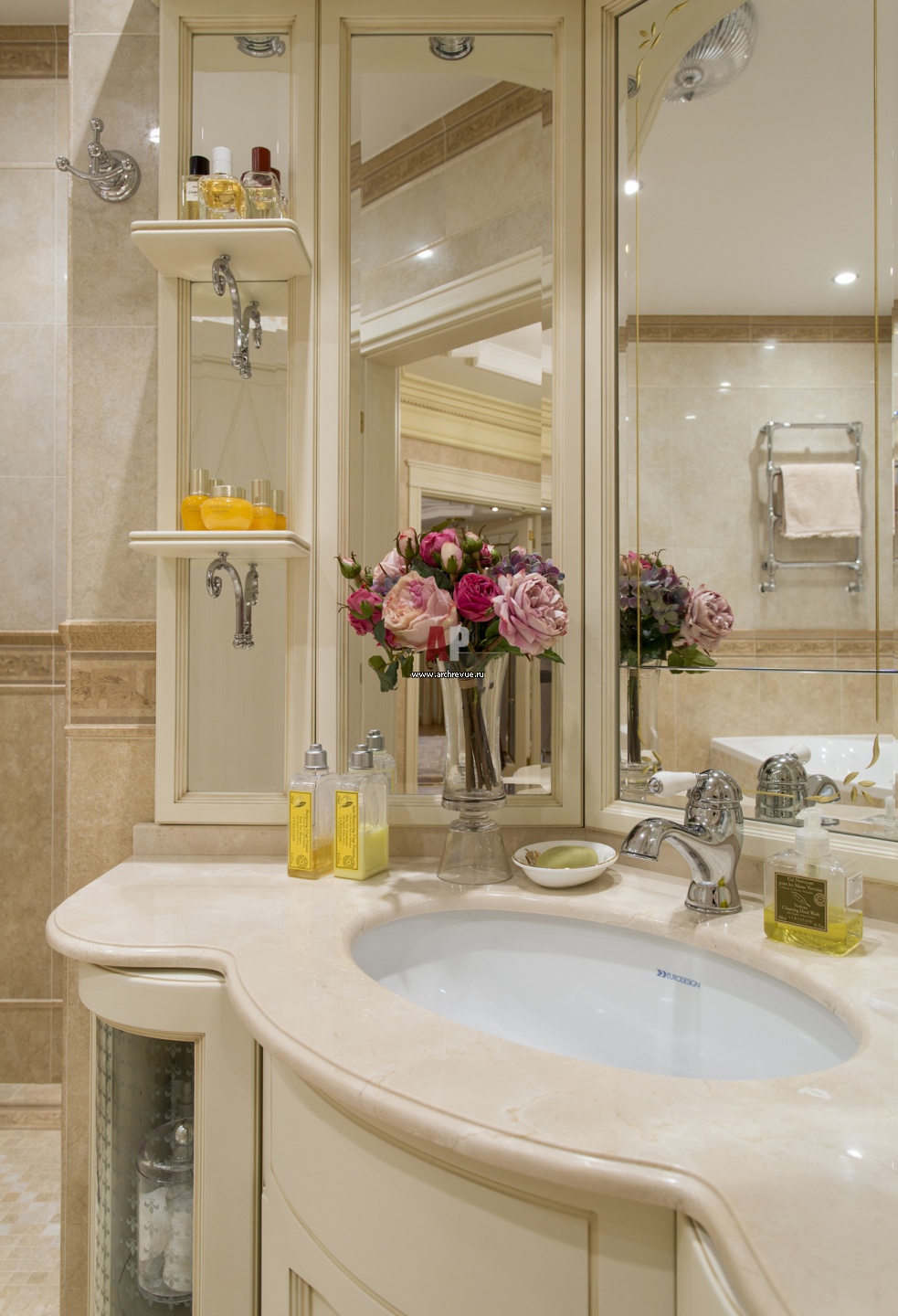 На фото – умывальник в родительской ванной комнате. Столешница со скругленными краями выполнена из бежевого мрамора.