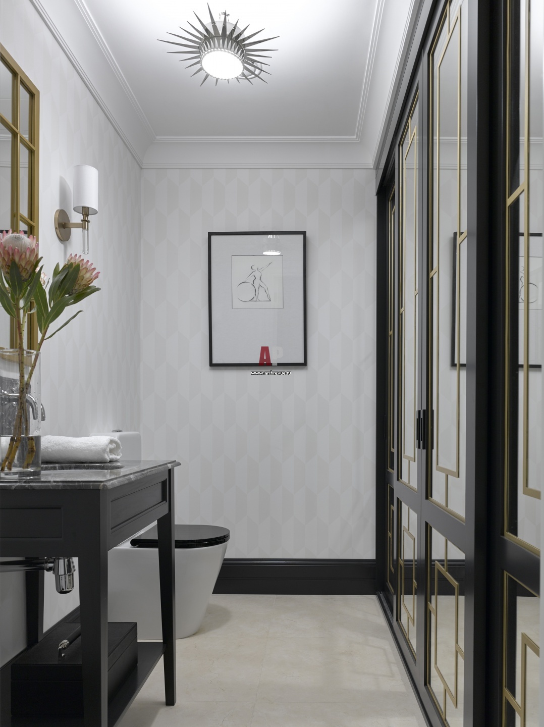 Интерьер гостевого санузла. Шкаф с зеркальными фасадами и латунными вставками скрывает постирочную. Обои, Cole & Son. Люстра, Visual Comfort & Co. Бра, Hudson Valley Lighting.