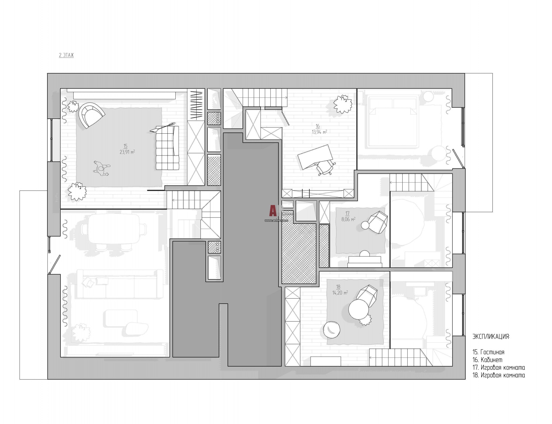 Планировка 2 этажа 2-х этажной квартиры для семьи с детьми.